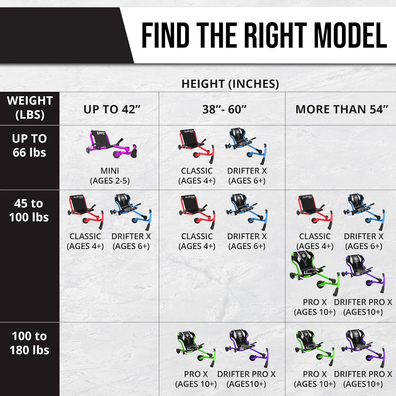 - Rider Age/ Max weight: Each rider is different and we typically recommend the Classic model for kids from about 38-39" (just under 100 cm) so about 4 years old. The Cllassic X comes with 2 extensions to grow with riders up to about 14 years old and over. We have a maximum recommended weight of up to 154 lbs (70kg) ; however in practice, any rider up to 100-110 lbs (45kg) will be comfortable on a Classic/Drifter seat. We recommend people over 120 lbs (55kg) and 5'5" (150cm) height ride the Pro models that have a wider seat. If you have any question, please contact us!